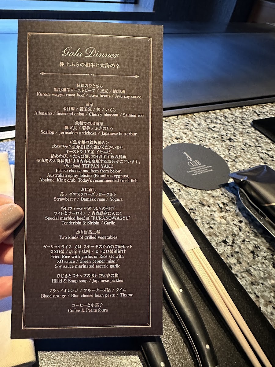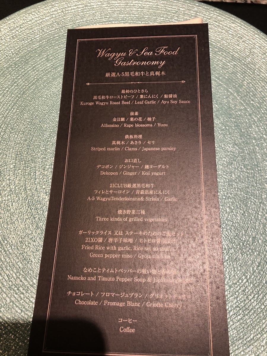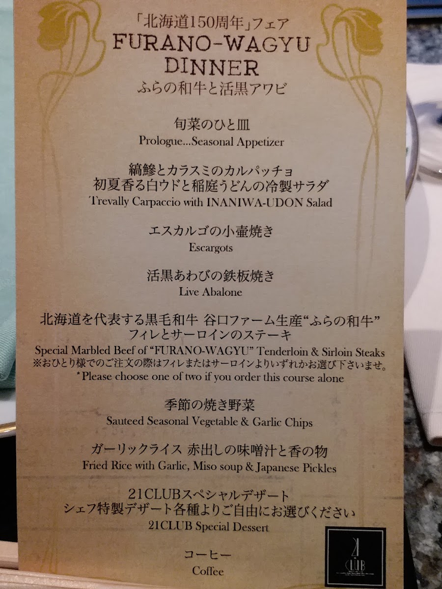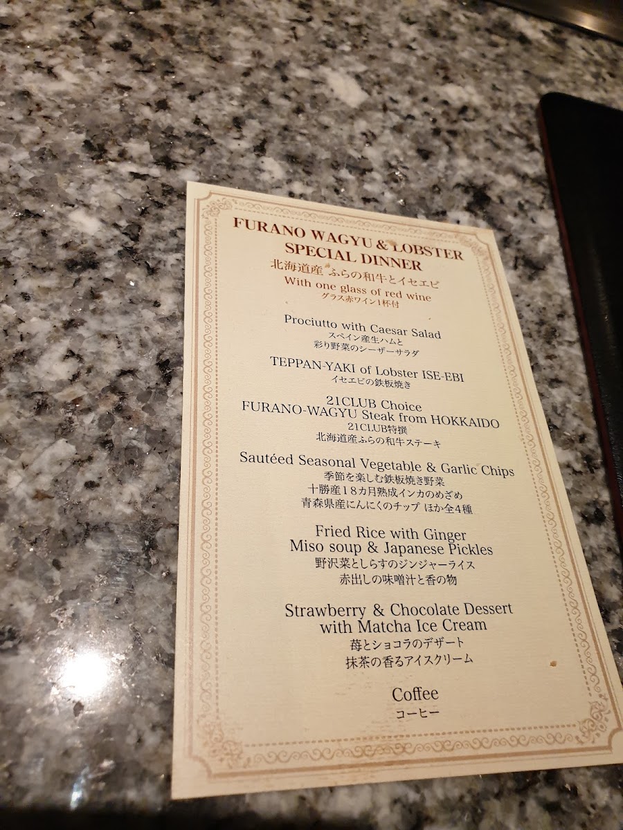 The menu at Seafood & Wagyu Teppanyaki 21Club offers a luxurious fusion of premium Hokkaido ingredients and expertly prepared teppanyaki dishes. For an unforgettable experience, the ETERNAL & ROSES 108 and ETERNAL & ROSES 33 sets are perfect for special occasions, featuring an elegant pairing of wines. The Hokkaido Teppanyaki course presents an impressive variety of dishes, including the Furano Wagyu Chateaubriand and live lobster from Nagasaki Prefecture, a standout offering that combines tender wagyu beef with the fresh taste of lobster. Other options highlight the harmony of land and sea, such as the Furano Wagyu beef and the taste of the sea, or the Teppanyaki of Australian spiny lobster and live black abalone. For those seeking the highest quality, the Specially selected A-5 Japanese black beef and live abalone and Specially selected A-5 Japanese black beef and seasonal seafood dishes deliver an exquisite dining experience. Each dish emphasizes the finest cuts of meat and the freshest seafood, making it clear that the restaurant prioritizes quality and craftsmanship in every course.