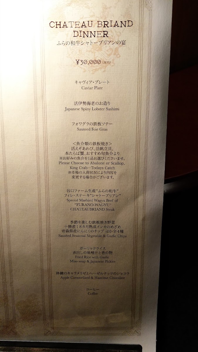 上質な肉質をもつ北海道産「ふらの和牛」の希少部位“シャトーブリアン”と、長崎県産の伊勢海老をお客様の目の前で繊細に焼き上げる、豪勢な美食コース/A luxurious gourmet course featuring the rare cut of Hokkaido's high-quality Furano Wagyu beef, Chateaubriand, and Ise lobster from Nagasaki Prefecture, delicately grilled right in front of your eyes./将北海道优质富良野和牛的稀有部位、夏多布里安牛排、长崎县伊势龙虾等在眼前精心烤制而成的豪华美食套餐。/將北海道優質富良野和牛的稀有部位、夏多布里安牛排、長崎縣伊勢龍蝦等在眼前精心烤製而成的豪華美食套餐。/상질의 육질을 가지는 홋카이도산 「후라노 와규」의 희소 부위 “샤토브리안”과, 나가사키현산의 이세 새우를 고객의 눈앞에서 섬세하게 굽는, 호세인 미식 코스